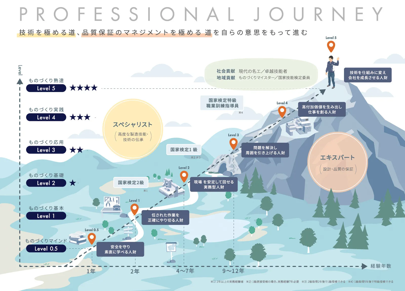 国家検定取得と連動し、レベルが上がるごとに仕事の面白さが深まるキャリアマップを導入しています。