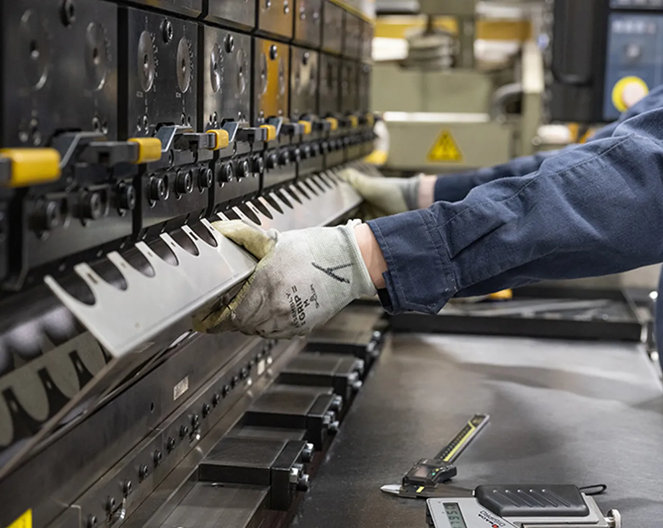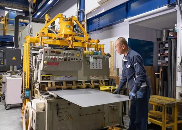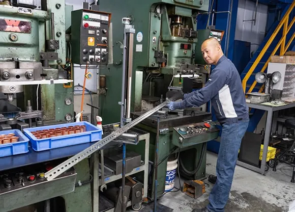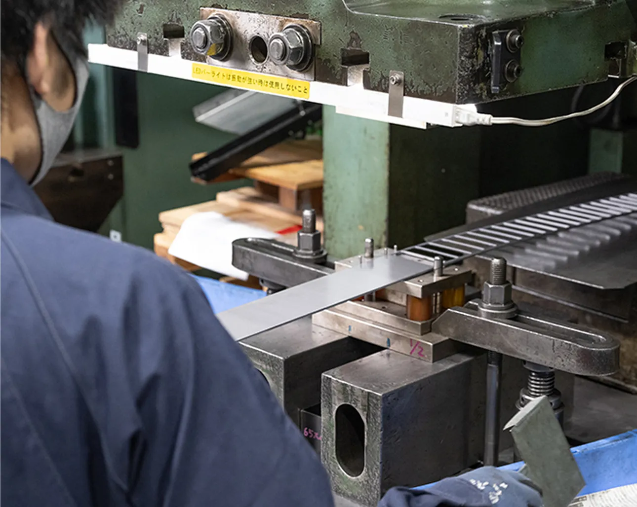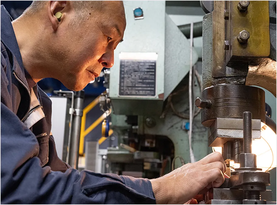 プレス加工設備を駆使し、鋼やステンレス、チタンなど様々な素材を加工します。製品の形状や材料に応じて、機械を微調整する職人の目が求められます。